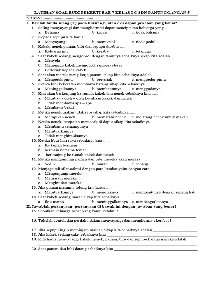 Artikel ini akan menyajikan serangkaian contoh soal budi pekerti untuk siswa kelas 5 semester 2 yang dirancang sesuai dengan semangat KTSP. Soal-soal ini tidak hanya menguji pemahaman siswa terhadap konsep, tetapi juga mendorong refleksi dan penerapan nilai-nilai tersebut dalam kehidupan nyata. Dengan variasi bentuk soal, mulai dari pilihan ganda, isian singkat, hingga studi kasus, diharapkan para pendidik dapat memanfaatkan ini sebagai referensi dalam merancang evaluasi pembelajaran budi pekerti yang efektif dan bermakna.